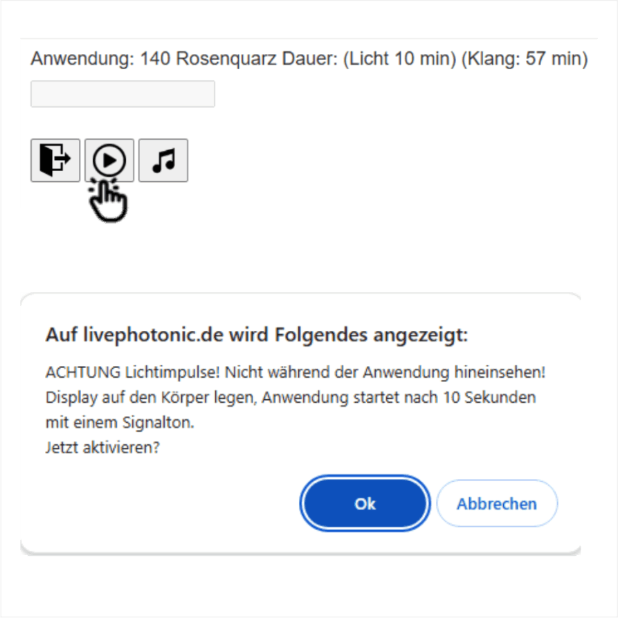 ACHTUNG! Photonensequenzen sind schnell aufeinanderfolgende Lichtimpulse, die bei Epileptikern Anfälle auslösen können. Daher sollte man es vermeiden direkt auf das Display zu sehen, während die Anwendung läuft.