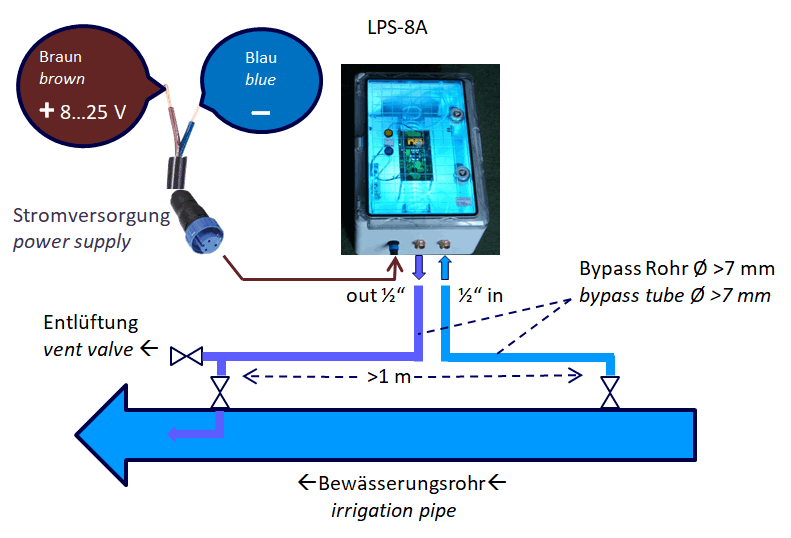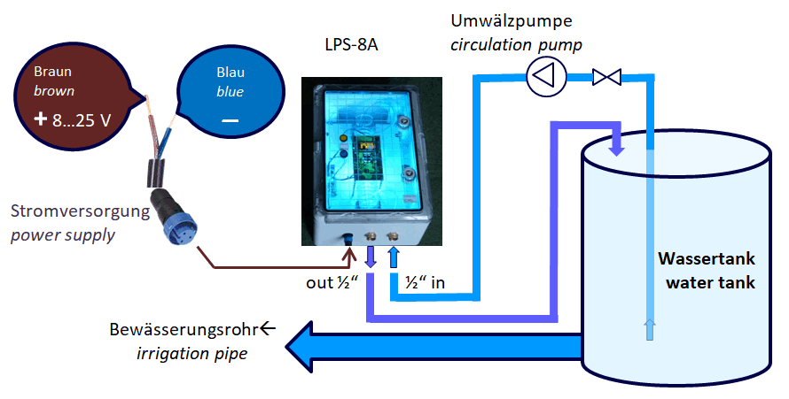Dabei stehen mehrere Möglichkeiten zur Verfügung: Der LPS-8A bestrahlt das Wasser mit Photonensequenzen, während es durch das Gerät fließt. Bei geringen Wassermengen kann es im direkten Durchfluss verwendet werden. Bei größeren Wassermengen wird der LPS-8A als Bypass in das System eingebunden. So das nur ein Teil des Wassers durch das Gerät fließt und wieder in das Bewässerungssystem geführt wird, wo es sich mit dem Wasser in der Hauptleitung wieder mischt. Der LPS-8A kann auch mit einer Umwälzpumpe für ein Wassertank genutzt werden.