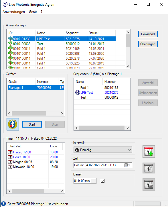 Die integrierte Bluetooth Schnittstelle ermöglicht die drahtlose Übertragung der Photonensequenzen zum Gerät. Entweder per LPS Manager App, oder mit der Live Photonic Agrar Computersoftware für Windows. Die Photonensequenzen und Funktionen werden an dem OLED Display des Gerätes angezeigt. Der LPS-8A kann manuell über die Tasten am Gerät, oder über Bluetooth mit der Computersoftware gestartet werden. Das Gerät verfügt zusätzlich über eine Autostart Funktion, die es ermöglicht die Anwendung automatisch mit der Stromversorgung zu starten. So kann es bei Bedarf mit dem Einschalten von Pumpen, Ventilen usw. zu koppeln. Die Computersoftware bietet zusätzliche Möglichkeiten, wie Zeitgesteuertes Starten und Beenden von Anwendungen.